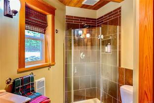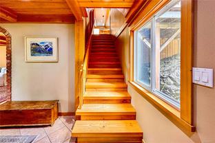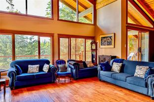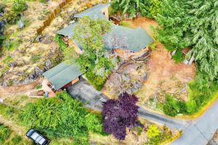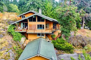 Remarkable ocean-view home overlooking Gowlland Harbour on Quadra Island's west side. This beautiful family residence features post and beam construction with high vaulted ceilings, blending seamlessly with its natural surroundings, including a towering arbutus tree in the front yard and stunning rockwork around the gardens. The lower level offers a spacious family room with a wood stove and original brickwork, a bedroom, and a guest suite with a four-piece bathroom and private deck, ideal for a B&B. Stairs lead up to the main level, which boasts a spacious open floor plan. The kitchen features oak cabinets, a custom wood island, tile flooring, and stainless steel appliances, with a door opening to a side deck that wraps around the back of the home. The dining room has a sliding door to the large front deck, and the sunken living room features a floor-to-ceiling rock fireplace. The master bedroom on the main level includes a walk-in closet, a sliding door to the front deck, and a four-piece ensuite. The upper level features a loft area currently used as an office space and another bedroom. This home showcases beautiful wood finishes and custom tile work throughout. Additional amenities include an attached garage/workshop at the front and a detached storage shed in the backyard. Situated on a beautifully landscaped, fully fenced 0.4-acre lot with a sunny westerly exposure, established garden beds, and fruit trees, this property is midway between Quathiaski Cove and Heriot Bay. It offers easy access to all services: a five-minute drive to either location and less than a five-minute walk to a marina.