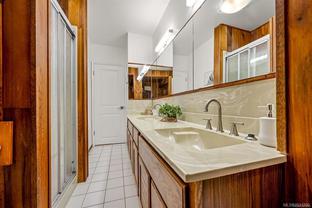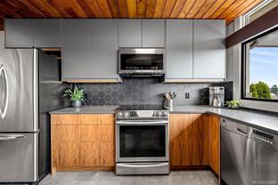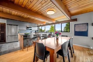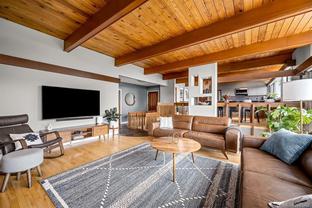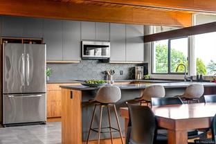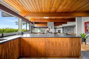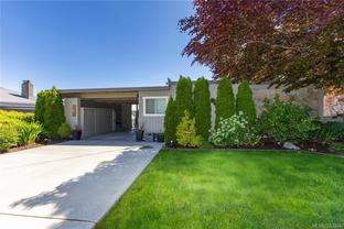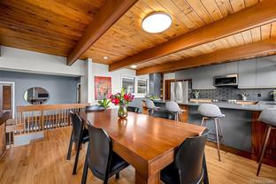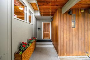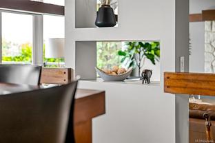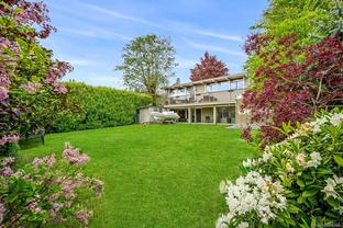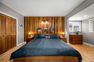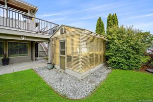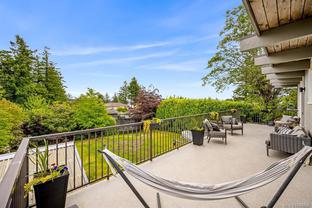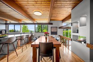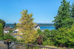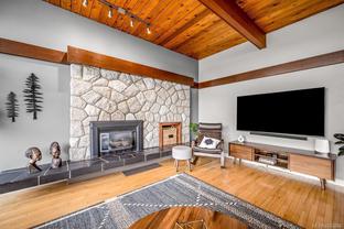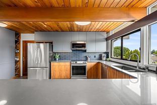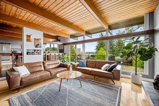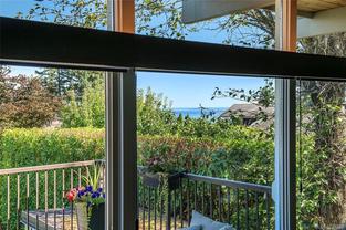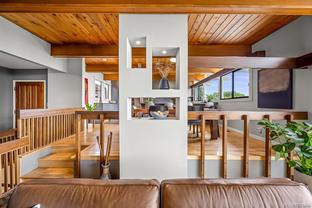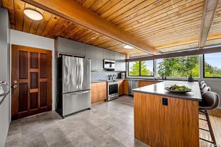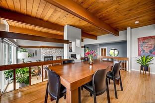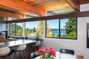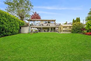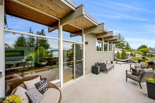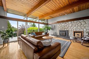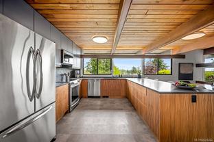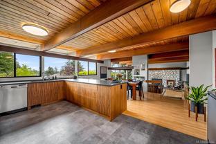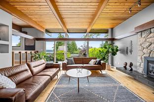 A rare mid-century modern that perfectly balances vintage craftsmanship with modern comfort. This stunning post-and-beam home showcases clean lines, warm wood tones, and ocean views that define West Coast living. Nearly 3,000 sq. ft. of beautifully curated living space designed for connection and ease. This includes a sunken living room with gas fireplace, custom walnut and quartz kitchen, and a 38-ft deck that extends your living outdoors. Major upgrades—new roof, heat pump, 200-amp, Flexstone decking, and resurfaced driveway—blend seamlessly with the home’s architectural soul. The main floor offers 3 bedrooms, 2 baths, and laundry, while the lower level adds 2 more bedrooms, a den, and a large family room—ideal for guests or multigenerational living. Outside, enjoy a private yard with greenhouse, storage sheds, and lane access. Set in a highly sought-after neighborhood close to everything, this is mid-century modern living at its best: refined, functional, and truly timeless.